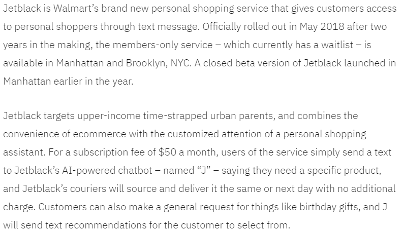 It seems a customer of Jetblack spent an average of 1500 $ per month, but the costs for Walmart amounted to $15,000 per year per member, as of last summer. Also, JB overlapped with Walmart’s own home delivery options, including its successful Walmart Grocery service, which could deliver the fresh food Jet black could not.
